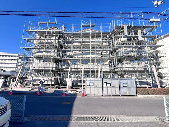 現在は、建物全体に大規模な足場が組み上がっています。