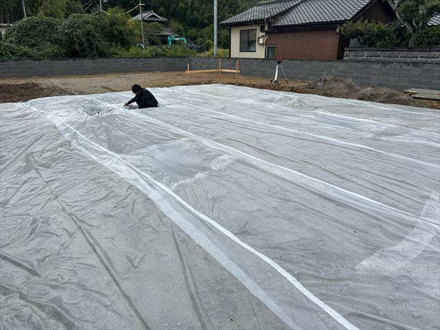 こちらの写真は、防蟻処理を終え防湿シートを敷いた所です。防湿シートを敷くことにより、地面からの湿気を防ぎカビやシロアリの発生を防ぎます。