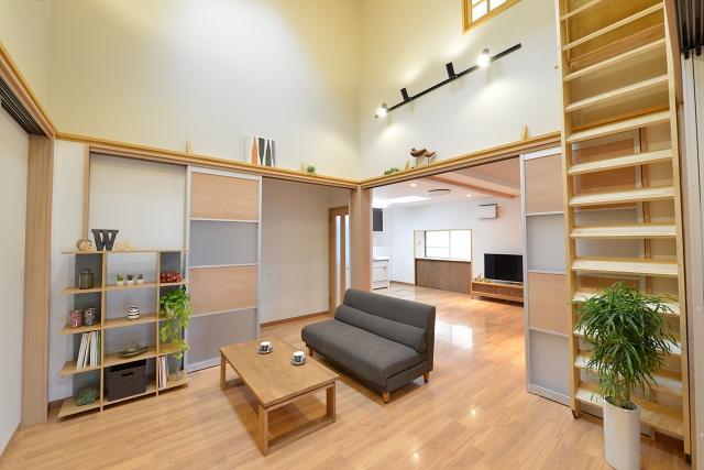 リビングとスキップフロアになった和室の仕切りには格子を作成しております。