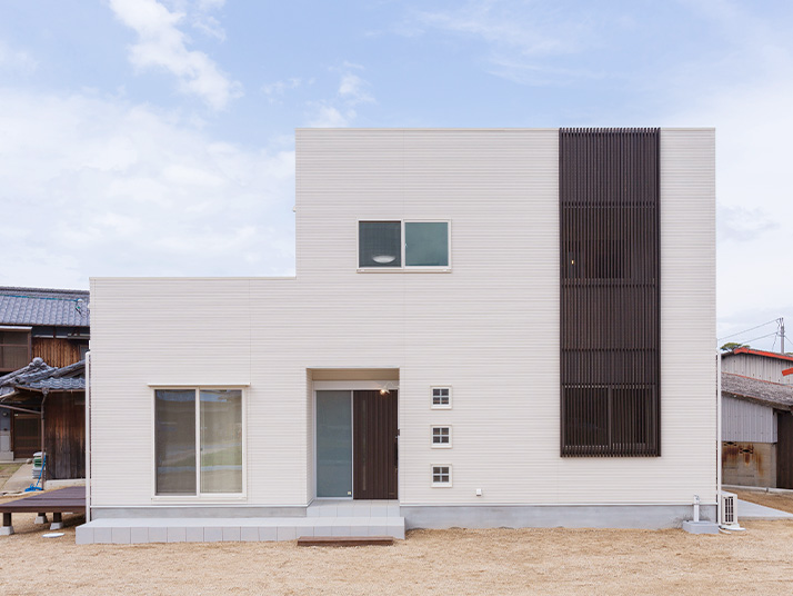 白いキューブに大きな格子をあしらったシンプルな外観のA様邸。