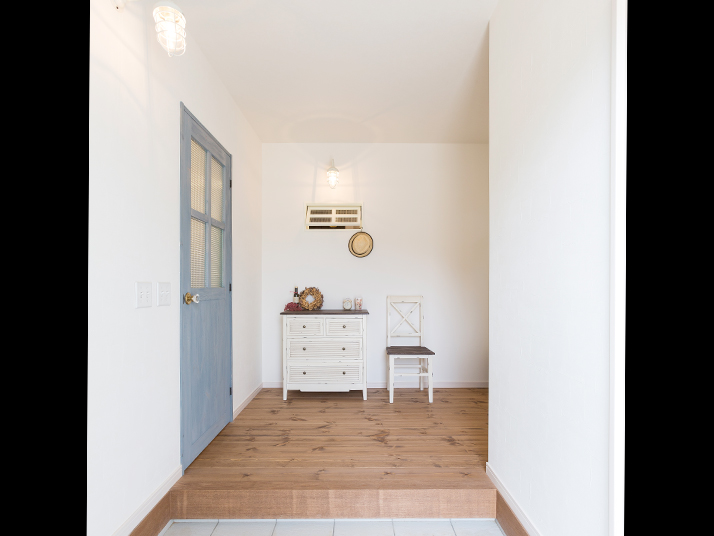 玄関を入ると、シューズクロークを備えたすっきりとしたホールと、ガラスやノブにまでこだわったブルーのドアがお出迎え。