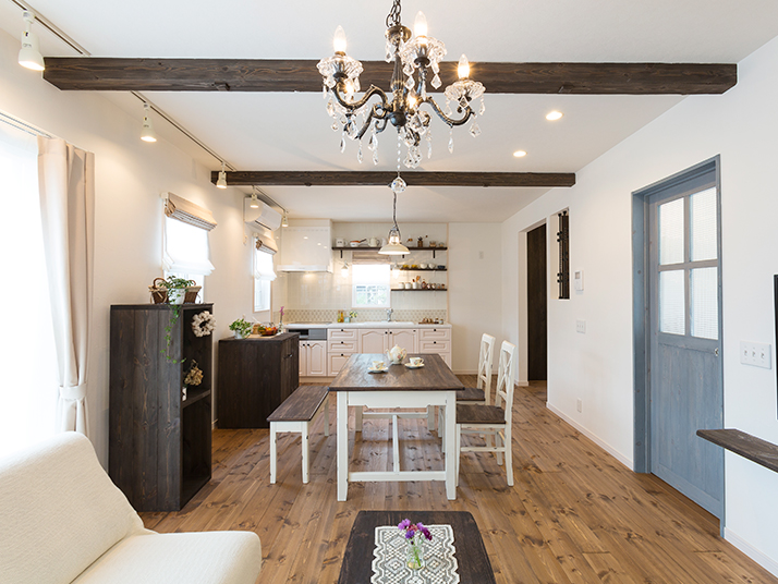 リビングの梁や造り付けの家具は、大工さんがエイジング加工を施しアンティーク風に。