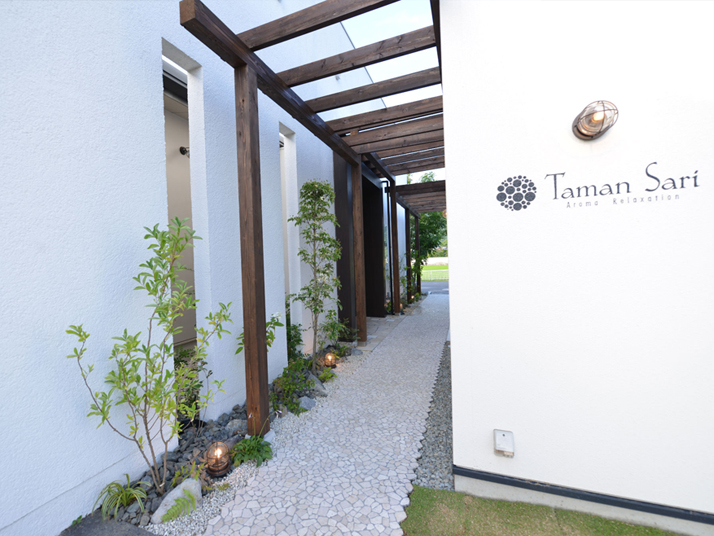 素敵なリラクゼーションサロン 青い空に白壁が映える素敵なリラクゼーションサロン「Aroma Relaxation Taman Sari」 少し狭めに作られたエントランスは、プライベートな空間を感じさせます。 内装も、本場バリの雰囲気を加えつつ、落ち着いた空間になっています。 心も体もリラックスできそうな素敵な空間で、ちょっぴり贅沢な気分を味わえそうですね♪ 夜、ライトアップされた様子もまた一味変わって素敵です。