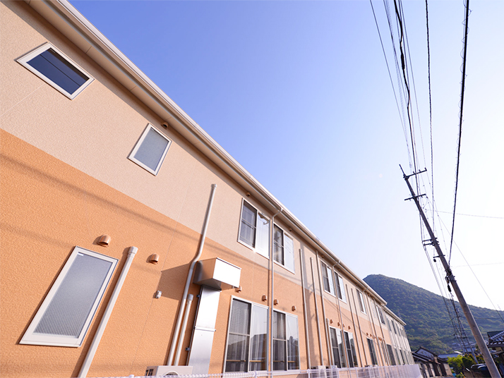 オレンジのツートンカラーが印象的な外観。白のサッシで清潔感を強調し、青空に映えるデザインとなっています。 内装は落ち着いてゆったり過ごせるよう白を基調とし、全体に明るく家庭的な雰囲気にまとめました。 居室内は通風性と採光性のバランスにこだわり、ゆとりが感じられる間取りに仕上げています。 木造ならではの温かみが、高齢者の方にとって心地よく感じていただけると思います。