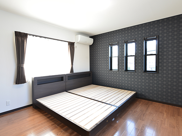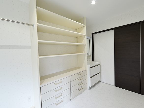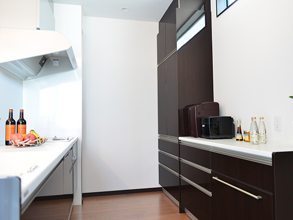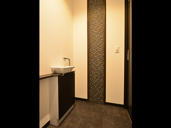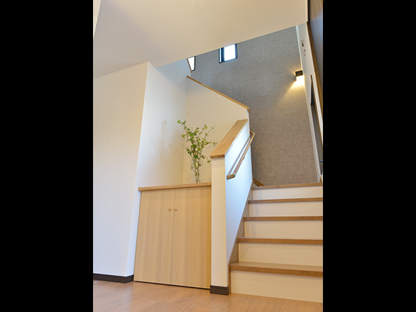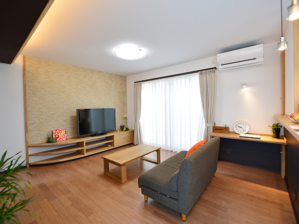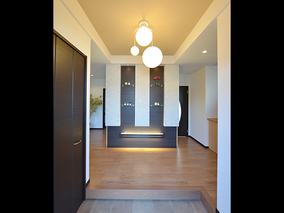 折り重なる屋根と水平ライン、レンガ調の外壁、縦長の連窓が美しいカントリー風の外観。深みのある色合いの瓦がやさしく存在感を主張しています。 玄関正面の飾り棚は棚板にガラスを用いて、ショーケースのような高級感のある趣に。 リビングの壁に設置したオリジナルデザインのテレビボードは、大工さんの造り付け。壁には除湿・消臭効果もあり、デザイン性も抜群なエコカラットを使用しました。折り下げ天井や間接照明が広がりを演出し、住まいに遊び心とゆとりを感じさせます。 また、階段下やキッチンのデッドスペースを収納として有効活用するなど、細部にもこだわりました。