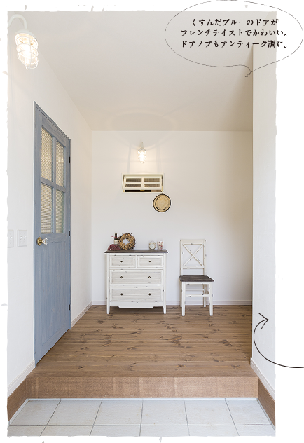 照明は奥さまの好きな「マリンブランケット」。全体的にアンティークな風合いでまとめながら、清潔感や爽やかさも感じられる玄関ホールになりました。