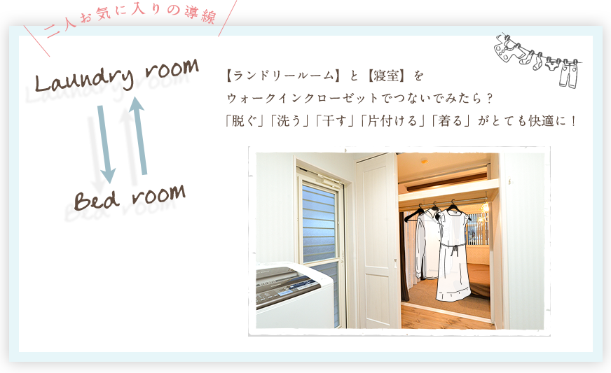 洗濯機を置いた 「 ランドリールーム 」と隣の寝室から、クローゼットを両面使いに。